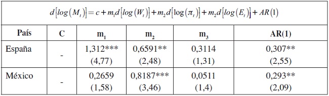 En los resultados de la ecuación de importaciones también destaca la diferencia entre ambos países. Mientras que en España la elasticidad de las importaciones respecto de los salarios es significativa y mayor que la de los beneficios, lo cual indica que la importación de bienes de consumo es mayor que la de bienes de inversión y materias primas, en el caso de México los salarios, aunque positivos, no resultan significativos. Las importaciones aumentan cuando aumentan los beneficios, debido a la importación de bienes intermedios más que de consumo. El tipo de cambio nominal es significativo y del signo esperado, aunque en el caso de México el valor es pequeño.