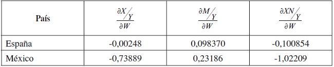 Como puede observarse, el efecto de un cambio en los salarios reales en las exportaciones netas es negativo. Un aumento de los salarios reales reduce las exportaciones netas, lo que empeora el componente externo de la demanda agregada. El efecto es mucho mayor en el caso de México que en el de España, probablemente debido a la distinta posición en el mercado internacional de cada uno de los países. Mientras que España comercia, principalmente, con los países de la UE y parece situarse dentro del marco de especialización en ciertos productos, México se sitúa en competencia con países de bajos costes salariales, por lo que un cambio en los salarios reales tiene un gran efecto sobre su posición competitiva internacional.