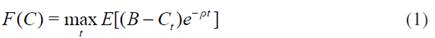 Let us denote the option value or the opportunity of investment that nature has given to women as F (C), which represents the objective function that they aim to maximize. Writing the payoff from having a child at age t as the difference between the benefits and the costs B − Ct , the goal will be to maximize its expected present value-