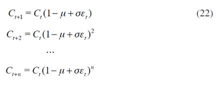 How do the costs of childbearing evolve in time? It is proposed here that the costs of bearing are subject to uncertainty and that they decrease over time. They can be formally represented by a mathematical expression that captures both characteristics: the stochasticity of the variable and the negative drift; a good candidate for this purpose is a geometric Brownian motion, which is commonly used in Finance to analyse entrepreneurs’ investment decisions where net benefits are not certain and are irreversible (in the same way as childbearing is). Thus, Ct may be represented as follows5.