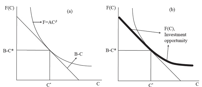 Figure 1 shows the optimal childbearing decision-making path. In panel (a) we see both, the F curve and the NPV curve, where the three boundary conditions are satisfied: 1) F goes to zero as the cost tends to infinity, 2) at the critical point the woman gets B − C∗ as a payoff, and 3) at the optimal level, the two curves are tangent, which is precisely the meaning of condition. This is because the value of the investment can never be lower than B − C.