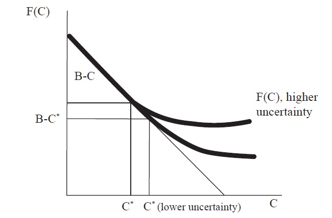 To better illustrate the impact of the parameters, let us compare the equilibrium situation of two different women, one experiencing a higher level of uncertainty than the other. Ceteris paribus, a higher implies a change in the slope of the F (C) curve (counter-clockwise rotation) and, therefore, a shift to the left of the critical cost C∗. As we can see in Figure 2, the investment opportunity curve that represents higher uncertainty, is above the other curve. This means that women with higher uncertainty obtain greater value from waiting. For them, the critical cost level is lower, and the expression