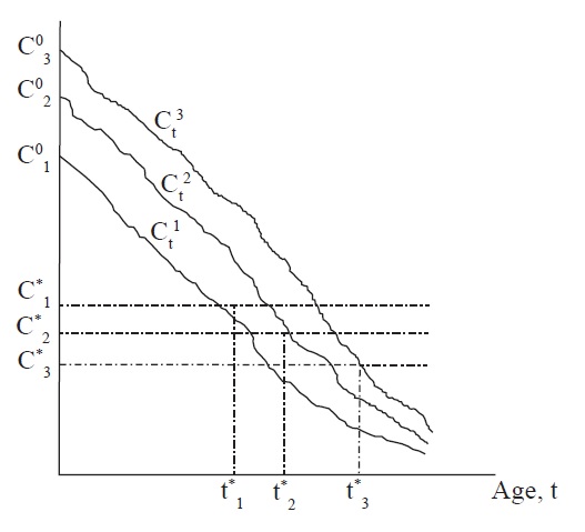 It is relevant to notice that the optimal age for first childbearing, at which Ct = C∗, depends significantly on the initial cost or the cost at the age of menarche for each woman. The higher the initial cost, the higher the value of waiting.