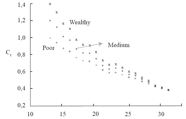 Figure 4 shows how these costs tend to converge for all types at the end of the analysed period, reflecting the assumption discussed earlier, namely that the forgone educational investment decreases in time. It is also observed that the initial cost is the lowest for the poorest type. The curves in this figure have been obtained by applying the evolution of the costs described in to each C0.