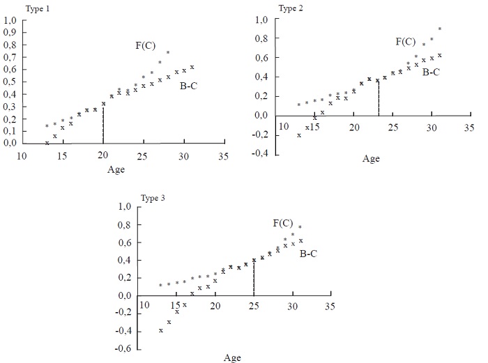 Let us start by obtaining Ct for the three types. The observed cost at any point in time is defined here as the difference between the potential schooling for each type ( Sp ) and the observed average schooling of women having their first child at each age ( St ),