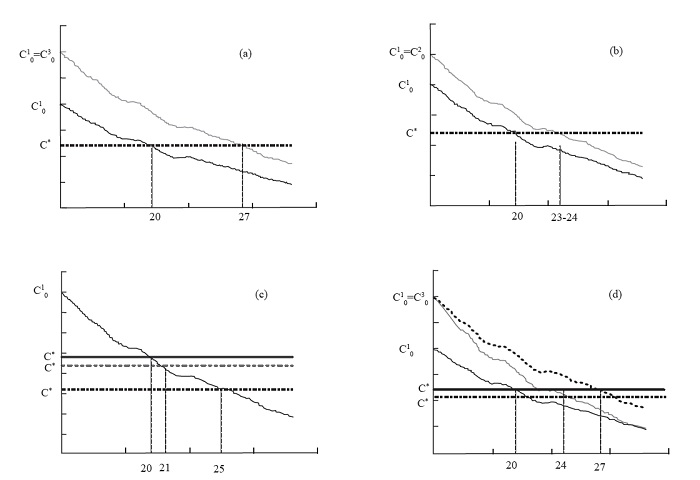 Figure 7, panels ( a) and (b) show the increase of the optimal age for first bearing if, ceteris paribus, the initial cost of the poorest group is set as equal to the initial cost of the other two types ( C10 = C30 and C10 = C20 respectively). If the initial cost of Type 1 women were as high as the cost of the wealthiest group, the optimal age would increase to 27 (the age at which C1∗ = 0.68 ). For the second case, the optimal age changes to 23-24 years.