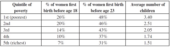 Fertility trends among the poor, measured as the average number of children per woman, have been decreasing in most developing countries during the last years with the exception of Africa. It seems that the current problem is not only about the number of children poor women bear, but the age at which they have their first child. Table 1 shows a representative sample of 41.344 Colombian women aged 20 to 49. The second and third columns correspond to the percentage of women who have given birth before the age of 18 and 23, respectively. Given its high incidence in all income level groups and especially among the poor, early childbearing is the issue of interest here. The third column of Table 1 shows that poor Colombian women have, on average, twice the number of children compared to wealthy women, which may also be related to their early entrance into motherhood.