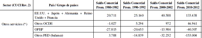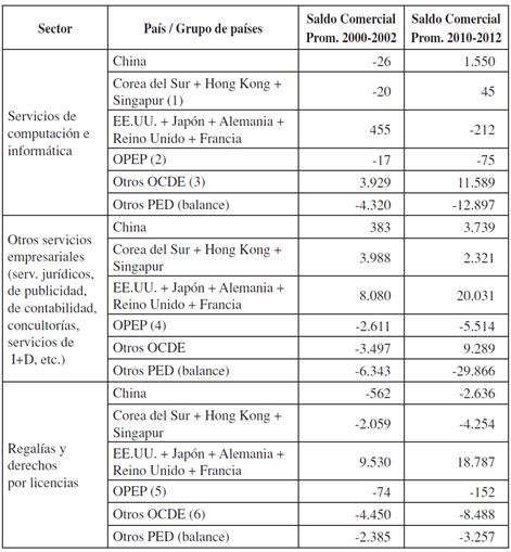 Para los “otros servicios empresariales” se tornan superavitarios asimismo el resto de los países de la Organización para la Cooperación y el Desarrollo Económicos (OCDE), y los países asiáticos; pero con saldos mucho menores a los del grupo de innovadores, especialmente en el último grupo de países. Por último, para los servicios de comunicación e informática se destaca la primacía del resto de países de la OCDE, y en segundo orden el superávit de China. Es importante mencionar que los países de la OPEP y el resto de los PED son demandantes netos en todas las subcategorías estudiadas.