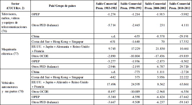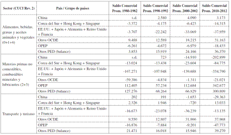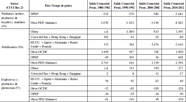 Por último, la Tabla A.4 del anexo muestra los sectores menos determinados por la dicotomía desarrollo/adopción de tecnología entre PD y PED, respectivamente. Allí se puede apreciar la especialización de los PED no petroleros en alimentos, bebidas, aceites y similares, y la de los países de la OPEP y otros PED como proveedores de petróleo, gas y otras materias primas no alimenticias, con exportaciones netas orientadas a los mercados de los PD y los países asiáticos.