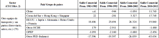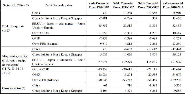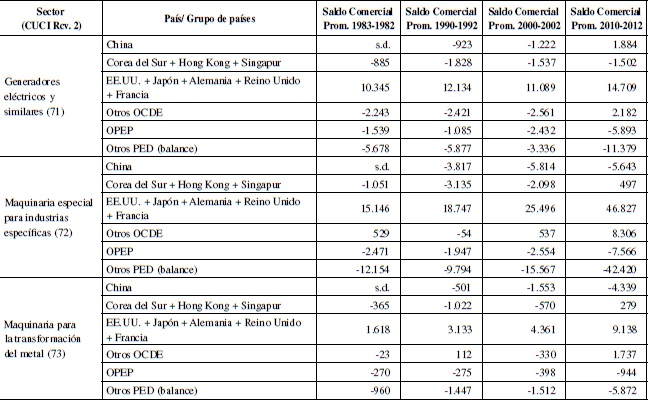 La Tabla 1 demuestra la clara especialización de los PD en la provisión de tecnología a nivel internacional. Allí podemos apreciar que el conglomerado de los cinco principales innovadores (Estados Unidos, Japón, Alemania, Reino Unido y Francia, categorizados por Dosi, 1991) están especializados en el comercio internacional en maquinaria y equipo, productos químicos y “otros servicios”, servicios en los que se canalizan diversas actividades de innovación (servicios empresaria-les, regalías, ingresos por licencias, servicios de computación e información, entre otros, tópico que se profundizará después del siguiente apartado). La contracara de estos superávits comerciales son los crecientes déficits de China (especialmente en maquinaria y químicos) y de otros PED. Esta especialización de los PD como proveedores de tecnología se ha reforzado en las últimas décadas, en particular, en la forma de maquinaria y equipo, y de servicios vinculados a innovaciones.