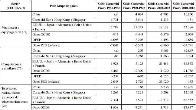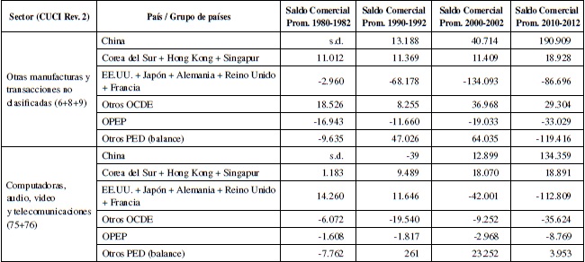 El correlato de esta especialización de los PD en provisión de tecnología a nivel internacional fue la industrialización basada en la adopción de tecnología extranjera por parte de los PED, especialmente los asiáticos. La Tabla 2 demuestra la fuerte especialización de China en la producción de bienes intermedios y fina-les industriales, proceso de largo plazo cuyos fundamentos se analizarán con más detalle en el siguiente apartado. La Tabla A.3 del anexo demuestra, por ejemplo, que el fuerte salto de exportaciones netas de computadoras por parte de China en la última década afectó a la baja los saldos comerciales de sus socios regionales en dichos productos, al posicionarse como el último eslabón en dicha cadena regional de valor. Por otro lado, cabe destacar la tendencia de largo plazo de este proceso de relocalización industrial: en las últimas tres décadas los países innovadores seleccionados pasaron de ser por lejos los principales proveedores internacionales de computadoras y productos de audio, video y telecomunicaciones, a ser fuertemente deficitarios en la actualidad, con la producción localizada en China y sus vecinos regionales.