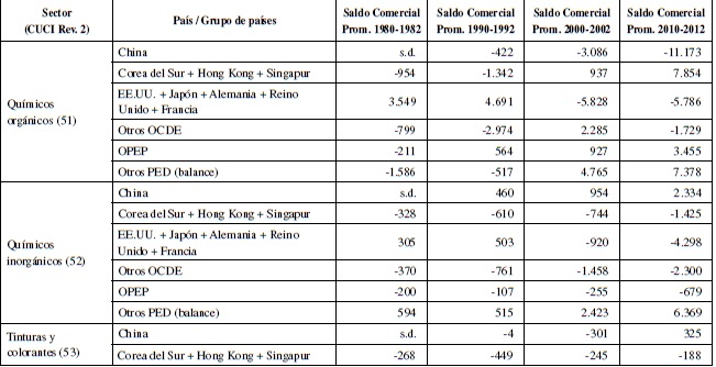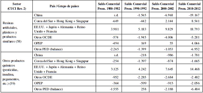 Al analizar pormenorizadamente el sector de productos químicos (Tabla A.2 del anexo) se pueden remarcar ciertas tendencias singulares. Primero, gran parte del superávit de los cinco países innovadores destacados se centra en el desarrollo y reproducción de materiales: resinas artificiales, plásticos, pesticidas, insulina, pegamentos, tinturas, y similares. En general, se aprecia un fuerte déficit del resto de los PED, complementado por un déficit comercial significativo por parte de China en resinas y productos plásticos. Todas estas especializaciones reflejan patrones productivos y comerciales de largo plazo, que no se han alterado significativamente en las últimas tres décadas. Sin embargo, la industria farmacéutica sí presenta cambios sustantivos: la clara especialización por parte de los cinco innovadores ha dado paso en una última década a un déficit comercial, y un fuerte salto exportador y superávit del resto de los países de la OCDE, al deslocalizarse actividades reproductivas en países con regulaciones de derechos de propiedad intelectual relativamente estrictos7. Aquí los compradores netos son principalmente los países de la Organización de Países Exportadores de Petróleo (OPEP) y otros PED, con intercambios comerciales relativamente equilibrados en los países del Sudeste Asiático y en China.