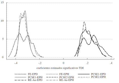 Con respecto a los resultados generales de los modelos estimados para cada panel, la siguiente gráfica muestra las funciones kernels de todos los coeficientes estadísticamente significativos8 de los 19.683 modelos estimados por GSREG.