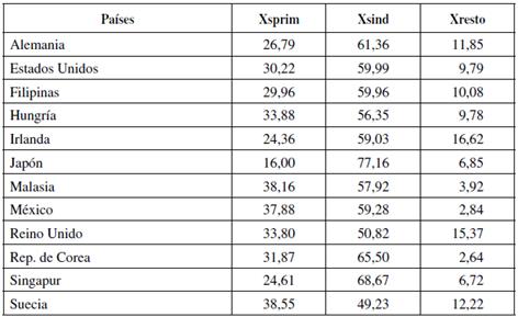 Una vez obtenidos esos ratios, se sacan los promedios del período en pos de clasificar los países en tres grupos: los que poseen un Xsprim promedio mayor al 60 por ciento, los que tienen una participación entre 40 y 60 por ciento, y los de menor a 40 por ciento. Se denomina EPD a los países del primer grupo, países con estructuras productivas homogéneas (EPH) a los del último grupo y se descartan los restantes.