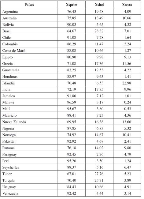 Una vez definidas las variables de interés para el análisis empírico, se aproxima la definición de EPD a partir de la información sobre exportaciones de UN Comtrade Database (UNSD). El criterio para la selección es determinar el porcentaje de participación en las exportaciones totales de los productos cuya producción depende, de manera relevante, del sector primario tomando la clasificación internacional de productos transportables de la CUCI revisión 4. Para tal objetivo, tomando los datos disponibles, se calculan los valores anuales de la participación en las exportaciones totales de los productos derivados del sector primario con nula o baja elaboración industrial (Xsprim) y de los productos manufacturados relativamente más complejos (Xind) durante el período 1991-2012 (véase Anexo).