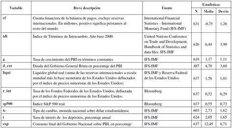 Por otro lado, las variables utilizadas para capturar los factores domésticos relevantes (pull) para explicar los flujos de capitales son: ratio de deuda pública externa sobre el PBI, tasa de crecimiento económico, tasa de interés doméstica de corto plazo; tipo de cambio nominal y gasto público sobre PBI.