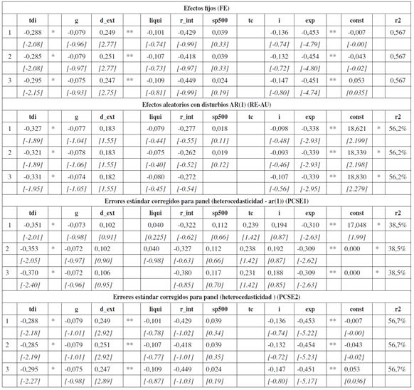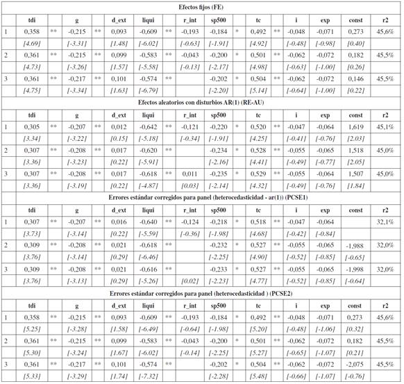 Como es esperado por la hipótesis de trabajo, los TDI están positivamente relacionados con la salida de capitales y son estadísticamente significativos en todos los casos. Esto es, un aumento de 10% de los TDI con relación a su desvío estándar generan una salida de capitales de entre el 3,1% y el 3,6%. Es valioso notar que los coeficientes estimados para los TDI son relativamente similares en todos los métodos de estimación, siendo inferior cuando se corrige por autocorrelación.