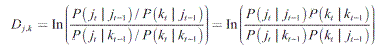 Donde Dj,k es el logaritmo del odds ratio que representa la distancia entre la coalición j y la coalición k, y P ( | ) es la probabilidad de votar por la coalición j (k) en el período t condicional a haber votado por la coalición j o k en el período anterior.