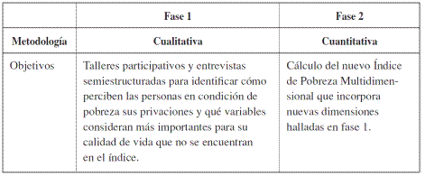 La naturaleza de la información presentada aquí es mixta; el uso de métodos mixtos, como se mencionó, es una herramienta necesaria para “obtener el máximo de información y perspectiva, mejorar la corroboración de los datos y obtener conclusiones menos sesgadas y más precisas” (Reamsa y Twale, 2008, p. 133), permite realizar múltiples inferencias que se confirman o complementan, y que al final de una fase de investigación llevan al diseño de la siguiente fase (Teddlie y Tashakkori, 2003) y son una herramienta fundamental para indagar temas de investigación complejos como la pobreza, toda vez que permiten abordar la manera como las personas en dicha condición se perciben a sí mismas generando una nueva definición de criterios objetivos (dimensiones de pobreza) que facilitan hacer comparaciones interpersonales de bienestar (González, 2000).