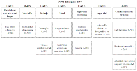 Para el cálculo del IPOM se utilizaron los mismos pesos para todas las variables y los mismos pesos para todas las dimensiones (Anexo 1). El punto de corte para considerar a alguien pobre también se mantuvo igual al establecido para el caso nacional (K = 33%). Los puntos de corte del nuevo índice así como la descripción técnica de cada variable se encuentran en la Tabla 4. No se tuvieron en cuenta variables que se encontraban en el índice que los participantes considera-ron cubiertas en la localidad tales como rezago escolar, analfabetismo, barreras de acceso a servicios para el cuidado de la primera infancia y trabajo infantil. En el Anexo 2 se encuentra el ejercicio de priorización de variables que se realizó en los talleres participativos en la etapa 1 de esta investigación.