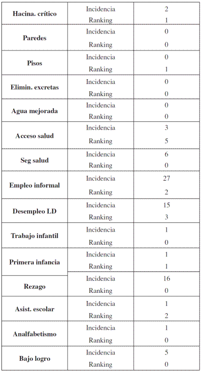 Otras variables para tener en cuenta son la dificultad en el acceso a agua y electricidad y el no aseguramiento. Llama la atención que la baja incidencia de la variable de inseguridad alimentaria no concuerda con los hallazgos del trabajo de campo, este hecho podría estar relacionado con el subreporte que podría existir en las encuestas por el carácter vergonzante de estas carencias para la población de estudio.
