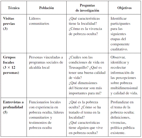 Esta investigación tiene un diseño metodológico mixto secuencial en dos etapas. La integración de datos de diferentes metodologías permite que los datos obtenidos dialoguen entre sí. Dicha aproximación tiene una dinámica propia y demanda una perspectiva diseñada para el entendimiento adecuado de los fenómenos sociales como la pobreza (Fielding, 2012). En este sentido, las fases del componente cuantitativo y cualitativo se desarrollaron así: