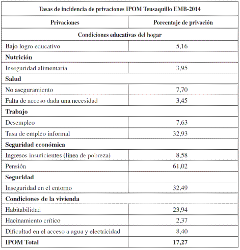 En Teusaquillo 17 de cada 100 habitantes son pobres ocultos. Los resultados de incidencia de pobreza oculta multidimensional ponen en evidencia que existen 5 variables que presentan un nivel de privación elevado en la localidad; la población en edad de estar pensionada que en el momento de la encuesta no recibía pensión alguna (61%), la informalidad laboral (33%), la inseguridad en el entorno (32%), las condiciones de habitabilidad de las viviendas en Teusaquillo (24%) e ingresos insuficientes (9%). Es importante resaltar que estas variables fueron identificadas por los participantes como muy relevantes en el contexto de su localidad hecho que se ve respaldado por las incidencias encontradas con la EMB-2014.