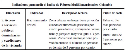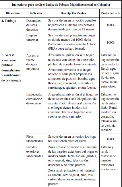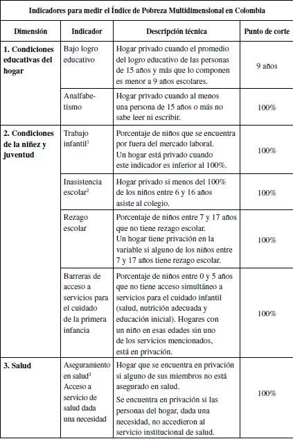 Desde 2011 se eligió el IPM como medición oficial de pobreza en Colombia con el objetivo de incluir variables susceptibles de ser impactadas por acciones de política pública y facilitar la rendición de cuentas pasando de lo multidimensional a lo multisectorial (Angulo et al., 2011). A escala nacional se establecieron 5 dimensiones y 15 variables con las siguientes definiciones y puntos de corte: