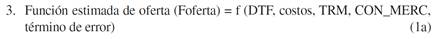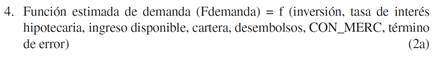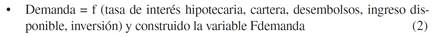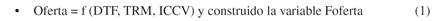 En segundo lugar, para estimar las funciones de oferta (Foferta) y demanda (Fdemanda) de vivienda nueva, para el caso de la demanda, consideramos la inversión, que no había sido tenida en cuenta en estudios anteriores, la tasa de interés hipotecaria, el ingreso disponible, la cartera y los desembolsos. Por su parte, para la oferta se utilizan los costos, la DTF y la TRM.