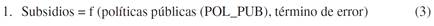En primer lugar, se encuentran los subsidios como función de las políticas gubernamentales (POL_PUB) (variable no observable) y se espera una relación directa con los subsidios. Hay que tener en cuenta que dentro de la variable “políticas gubernamentales” se recogen los efectos de la normatividad. Además, para la variable “condiciones de mercado (COND_MERC)”, que se ha definido como no observable en este sector, se considera que los subsidios, la inflación, el empleo y el crecimiento económico influyen en ella. Estas condiciones de mercado tienen una relación causal sobre la oferta y la demanda. A su vez, dichas funciones están determinadas por una serie de variables observables y no observables. Las variables utilizadas para medir la oferta y la demanda están fundamentadas en la teoría económica y la revisión de literatura, como se describe en el Esquema 2.