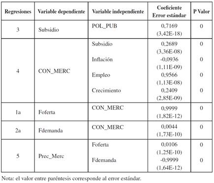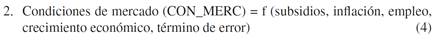 En relación con los signos obtenidos para las variables “inflación, empleo, crecimiento económico y los subsidios, que explican las condiciones del mercado (CON_MER)”, resultan acordes con los esperados, ya que un incremento en la inflación afecta de manera negativa las condiciones del mercado e incrementos en el empleo, en los subsidios o en el crecimiento económico influyen de manera positiva en estas condiciones. Es de esperar que, de acuerdo con las leyes de oferta y demanda para este sector de la economía, las condiciones del mercado influyan de manera positiva como se obtuvo en la estimación.
