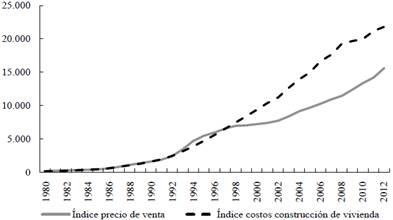 Si bien el período de estudio es entre enero del 2009 y diciembre del 2014, vale la pena hacer alusión al comportamiento del índice de precios y de costos desde 1980, en el que se percibe claramente el cambio en la tendencia de este. Como puede observarse en el Gráfico 1, con la caída del sistema UPAC (unidad de poder adquisitivo constante) y la crisis del sector constructor a finales de la década de los noventa, la cantidad de metros cuadrados licenciados en vivienda cae por debajo de los 6 millones, comparativamente, con los 12 millones que se tenían a media-dos de esa década. Esto, a su vez, conllevó al endurecimiento de la normatividad por parte de las autoridades competentes del sector, de tal forma que se empieza a evidenciar una brecha entre los dos índices, siendo mayor el de costos, a pesar de que en los últimos años el crecimiento porcentual de los precios ha estado por encima del de los costos.