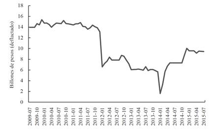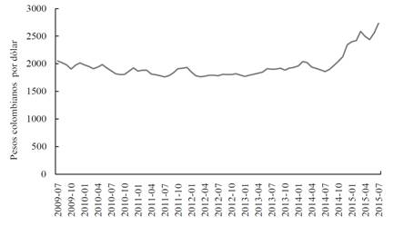 La TRM del 1º de enero del 2009 fue de $ 2.253,59, mientras que para el 31 de julio del 2015 fue de $ 2.866,04, lo que equivale a un crecimiento aproximado del 27%. El incremento acelerado de la TRM para el año 2015 se debió a la disminución acelerada del precio del petróleo durante este mismo año, al igual que la disminución de los precios comerciales de los bienes básicos que se exportan, lo cual ha ido en detrimento de los términos de intercambio. Por su parte, la desaceleración de las economías externas compradoras de productos colombianos como China, Japón y países americanos ha repercutido sobre la devaluación del peso frente al dólar (Banco de la República, 2015).