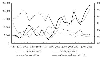 También existen estudios nacionales que demuestran que la demanda del sector de la construcción está, en alguna medida, determinada por la tasa de interés de colocación o hipotecaria (Aristizábal y Vargas, 2009; Clavijo et al., 2004; González et al., 2013; Saldarriaga, 2006) y por el nivel de ingreso de los hogares (Camacol, 2008a; González et al., 2013; Peláez, 2011).