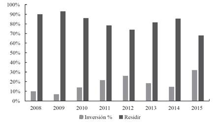 En el Gráfico 5 puede observarse el porcentaje de la intención de inversión para reventa y para arrendar y sus cambios durante el período 2008-2015. Los valores más pequeños ocurren durante el 2008 y el 2009, con un porcentaje de inversión del 10% y 7% respectivamente. Estos valores pueden estar explicados por la crisis internacional de la época y también por mayores tasas de rentabilidad en otros sectores. Para el 2010 incrementa en un 7% la demanda efectiva de vivienda que se hace para inversión con respecto al año anterior. En los años 2013 y 2014 la inversión en vivienda tiene unos valores destacables, del 22% y 26% respectivamente. En lo transcurrido del 2015, la intención de compra de vivienda para inversión es de un 32%.