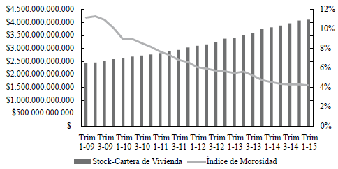 Asimismo, es de gran importancia evaluar la calidad de la cartera hipotecaria, ya que esta afecta los desembolsos hipotecarios y, por ende, la demanda. A mayor calidad de la cartera, el riesgo del pago de esta es menor, por lo cual las entidades financieras se ven incentivadas a seguir prestando. En el mismo Gráfico 6, en el eje derecho, se puede observar el comportamiento del índice de morosidad de la cartera de vivienda en Colombia. A medida que este índice disminuye, la cartera se vuelve menos riesgosa y, por lo tanto, aumenta su calidad. Entre el primer trimestre del 2009 y el segundo del 2015 este índice ha disminuido prácticamente a la mitad, al pasar de un 11% a un 5% para el período referido, lo cual significa un aumento en la calidad de la cartera morosa.