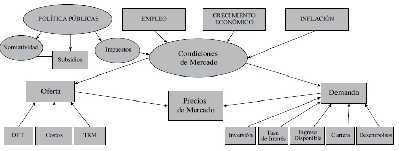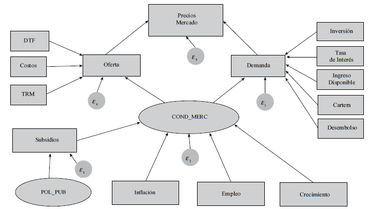 Como se dijo antes, las políticas públicas tienen una relación con las condiciones de mercado, las cuales, a su vez, tienen una relación causal sobre la oferta y la demanda de vivienda nueva. La relación existente entre las condiciones de mercado y la oferta y demanda es positiva y, también, la oferta y la demanda influyen en el precio de mercado.