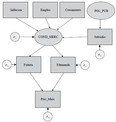 Las políticas públicas (POL_PUB) diseñadas en este sector, entre las cuales se encuentra la normatividad, que está orientada a fortalecer el sector y, por lo tanto, es de esperarse que influyan en los subsidios (FRECH) para incentivar el sector constructor (Camacol, 2008b; Mühleisen y Kaufman, 2003). Algunas variables como inflación, desempleo, crecimiento económico y los subsidios presentan un mecanismo de transmisión sobre las condiciones de mercado (COND_MERC) (Clavijo et al., 2004; García et al., 2014) que, a su vez, se reflejan en la oferta y la demanda (Nicholson y Snyder, 2010), y que, de acuerdo con la teoría económica, determinan la formación del precio de vivienda nueva.