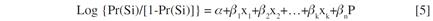 Donde como ya se mencionó en el vector X están las variables explicativas y P es la cantidad ofrecida como precio de salida (tasa), α es un término constante. En tal sentido, la diferencia en utilidad puede ser especificada como la variación Δν = α - βP, siendo por tanto posible calcular la media y la mediana de la disposición al pago como DAP = α/β, en esta clase de modelos15.