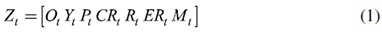 donde Ot es el precio internacional del petróleo, Yt es la producción, Pt son los precios de la economía, CRt es el riesgo país, Rt es la tasa de interés de política monetaria, ERt es la tasa de cambio nominal y Mt es un agregado monetario.