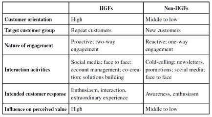 In general, the HGFs interviewed were engaging deeply with their customers and tended to focus on more proactive two-way engagement activities (e.g. account management systems) that had a high impact on customer perceived value. Given the customer-specific nature of these engagement activities, however, they required more firm resources (notably time) to effectively operate than the more reactive activities (e.g. newsletters or promotions) undertaken by the non-HGFs. Despite the greater resources needed to undertake such a depth of engagement, the HGFs interviewed clearly articulated their organisational focus on facilitating customer interactions with their ultimate goal being to create a sense of extraordinary experience for their customers.