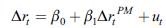 (2)Donde ∆rt son las variaciones en la tasa IBR a un mes entre el día t y el día t - 1, siendo t el día en que el banco comunica sus decisiones sobre la tasa de intervención. ∆rtPM son las variaciones en la tasa de política monetaria y ut es el término error.