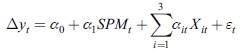 (3)Donde ∆yt= ∆t+1- yt es el cambio en los retornos de los títulos de deuda pública entre el día 1+1 y el día t, siendo t el día del comunicado de prensa, las minutas y los informes de inflación. Se asume que ∆yt es una medida de la volatilidad en los retornos de los títulos. Se utilizan títulos con madurez a 1, 5 y 10 años. El término SPM es el componente inesperado en canal de comunicación y Xit es un vector de tres variables explicativas o de control cuyas variables son calculadas entre t-1 y t. El vector de variables control busca entonces tomar en consideración aquellas otras fuentes de perturbación que alteran los títulos públicos en los días de la comunicación del banco central.