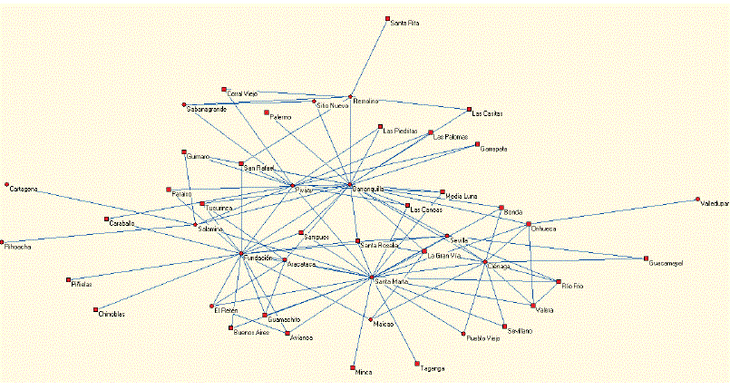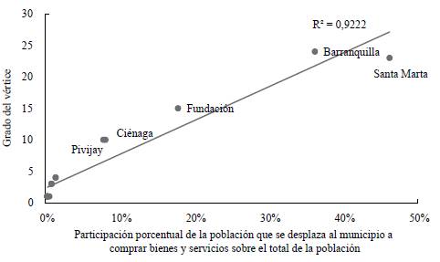 En la Figura 5, los puntos que más se alejan del origen son los que tienen mayor umbral en la lógica de la TLC. Se puede apreciar que Santa Marta (acude el 46 % de los hogares a comprar bienes y servicios) y Barranquilla (acude el 36 % de los hogares a comprar bienes y servicios) son los que más se alejan del origen, lo cual indica que son lugares centrales de primer orden. Por su parte, los municipios de Fundación (atiende al 18 % de los hogares), Ciénaga (atiende al 8 % de los hogares) y de Pivijay (atiende al 8 % de los hogares) son lugares centrales de segundo orden. En el Anexo 3 se presentan gráficamente todas las conexiones entre nodos.