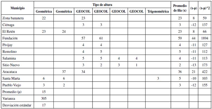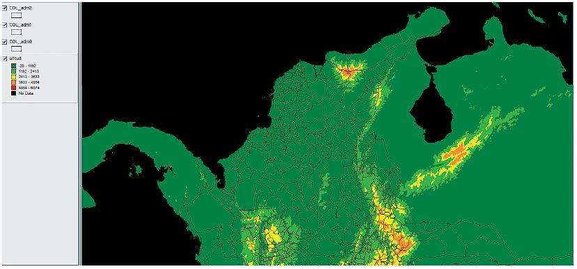 Para probar la isotropía espacial de nuestro caso de estudio, usamos las alturas promedio de las cabeceras municipales, utilizando información pública raster para Colombia en DIVA-GIS y de la Red Geodésica Nacional, Geodesia IGAG (Instituto Geográfico Agustín Codazzi). Según Geodesia IGAG, el promedio de altura fue 15 m.s.n.m., con una desviación estándar de 17 m.s.n.m.5 En consecuencia, se trata de nodos localizados en una región bastante plana, sin grandes diferencias topográficas (Anexos 6 y 7).