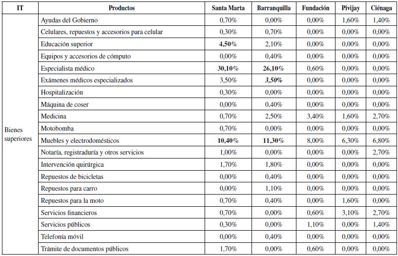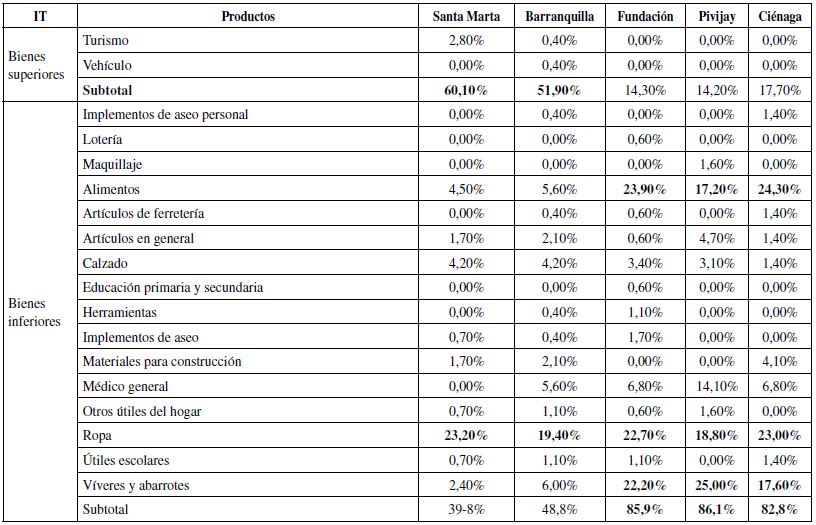 La información sobre los tipos de bienes comprados en cada uno de los cinco principales lugares centrales se presenta en la Tabla 1. Para el caso de Santa Marta y Barranquilla, los bienes superiores tienen una mayor proporción en relación con el total de bienes y servicios que los hogares compran en estos lugares centrales, el 60 % y 51,9 %, respectivamente, lo cual demuestra una vez más que estos son los lugares centrales principales. En cuanto a los lugares centrales de segundo grado: los municipios de Pivijay, Ciénaga y Fundación, los bienes y servicios que los hogares compran en mayor proporción son bienes inferiores (85,9 %, 86,1 % y 82,8 %, respectivamente).