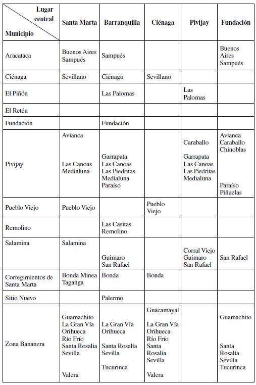 Se realizó una encuesta aleatoria en 353 manzanas, con representatividad muestral en el conjunto de municipios y corregimientos del norte del departamento del Magdalena (Anexo 1); es decir, que no hubo representatividad estadística de manera individual para cada municipio o corregimiento. En la encuesta, se preguntó si los integrantes de un hogar habían viajado fuera de su unidad espacial por motivo de compras de bienes o servicios, el lugar de estas compras y su tipo. De esta forma, se pudo realizar una caracterización de lugares centrales, su rango y su grado.