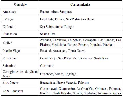 Este artículo estudia la región norte del departamento del Magdalena, compuesta por los siguientes municipios: Aracataca, Ciénaga, El Retén, Fundación, Pivijay, Pueblo Viejo, Salamina, Zona Bananera y Remolino. El estudio no incluye el casco urbano principal de Santa Marta, sino sus respectivos corregimientos que semejan más las condiciones socioeconómicas de la región. Tanto Santa Marta (casco principal) como Barranquilla se incluyen solo como posibles lugares centrales de destino, debido a su indudable importancia económica.6