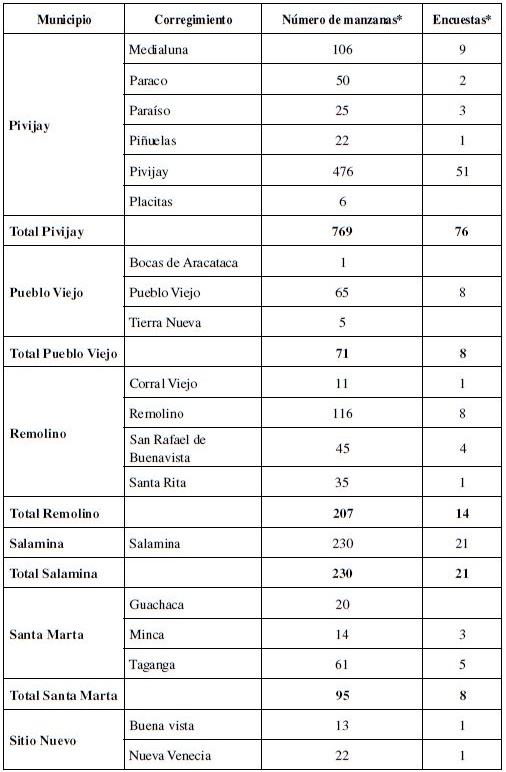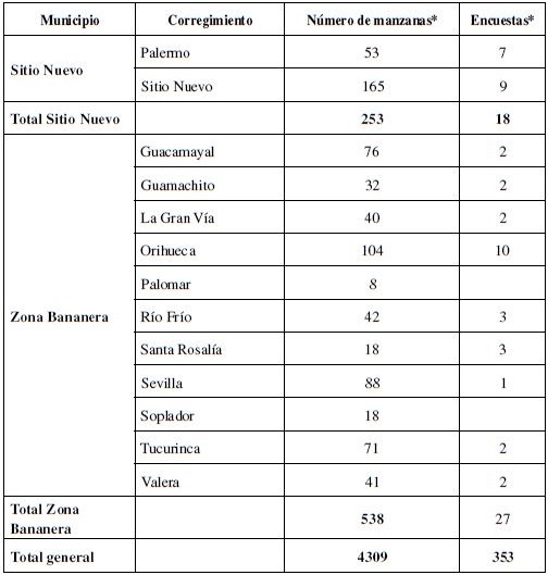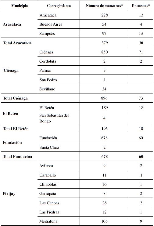 En los municipios y corregimientos del norte del Magdalena, se practicaron encuestas usando un muestreo aleatorio simple. La representatividad fue en toda la población objeto del estudio. Puesto que la población de manzanas de todas las cabeceras municipales y corregimientos en la región es de 4309, aplicamos una fórmula de selección de tamaño de la muestra bajo supuesto de normalidad. Con un error del 5 %, este valor fue de 353 observaciones.