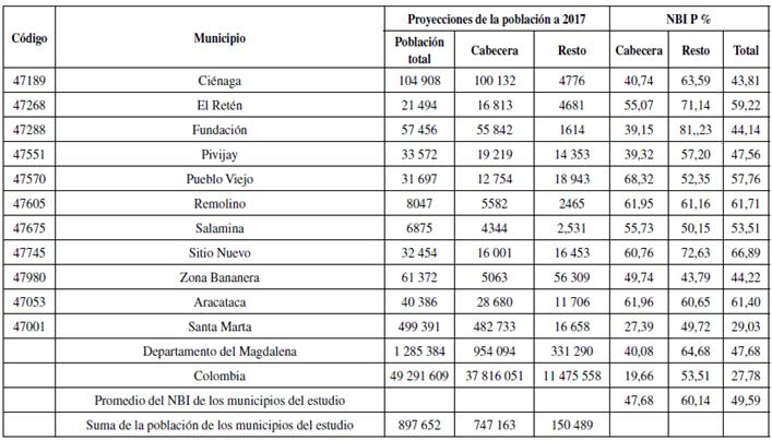 Vale indicar, por último, que la población que habita estos municipios es más pobre, según la medición de necesidades básicas insatisfechas (NBI) del DANE, que Colombia (NBI: 20) y el departamento del Magdalena (NBI: 40), ya que registra un NBI promedio de 47,68, siendo las áreas rurales más pobres que las cabeceras (Anexo 4).
